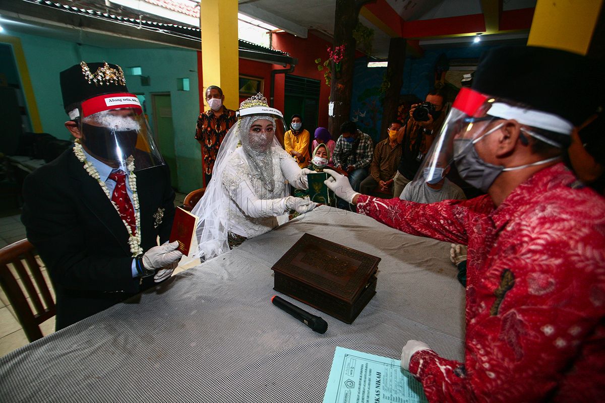 Pasangan Yoga Prianatha dan Ika Wahyuning Sejati menggunakan face shield, sarung tangan dan masker saat melakukan ijab kabul di Kantor Urusan Agama (KUA) Tandes Surabaya, Jawa Timur, Kamis (21/5/2020). Pasangan ini melangsungkan pernikahan mereka secara sederhana, yang hanya disaksikan keluarga terdekat dan mematuhi himbauan Kementerian Agama, yang meminta pelayanan pencatatan nikah di Kantor Urusan Agama (KUA) selama masa pandemi Covid-19 dengan mematuhi protokol kesehatan saat melangsungkan pernikahan untuk mencegah penyebaran wabah covid-19.