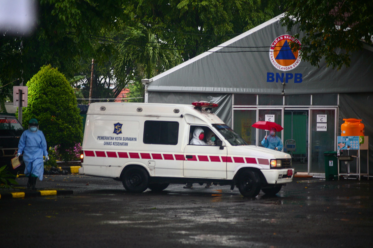 Mobil ambulans melintas di samping petugas medis yang bertugas di luar ruangan pada hari pertama beroperasi di Rumah Sakit Lapangan Covid-19 Jawa Timur, di Jalan Indrapura, Surabaya, kamis (28/5/2020). Pada hari pertama beroperasi Rumah Sakit Lapangan khusus menangani pasien covid-19 tersebut telah menerima sejumlah pasien dengan gelaja ringan. Dengan total kapasitas saat ini mencapai 200 tempat tidur, dan bisa dimaksimalkan sampai 500 orang. RS Lapangan Covid-19 Jatim ini akan diperuntukkan bagi pasien konfirmasi positif baru yang terkategori ringan dan sedang. Raya/INPhoto