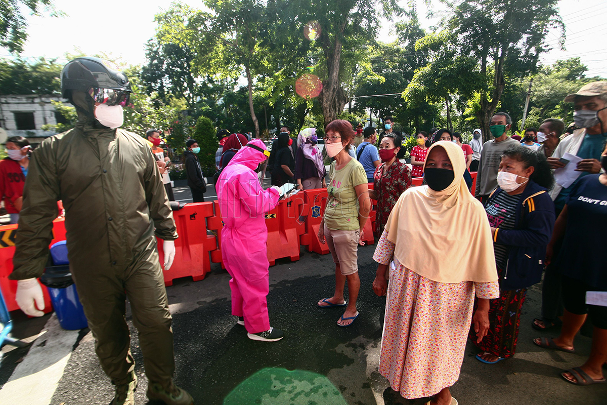 Petugas Medis melakukan pengambilan sampel darah warga untuk diperiksa dengan metode rapid tes (tes cepat)di halaman gedung Siola, Surabaya, Jumat (29/5/2020). Rapid Tes yang digelar Pemerintah Kota Surabaya bekerja sama dengan Badan Intelenjen Nasional digelar secara massal diikuti oleh ratusan warga Surabaya, dengan mendaftar lebih dahulu di Puskesmas setempat. Rapid tes massal tersebut untuk memutus mata rantai penyebaran covid-19 secara menyeluruh dikawasan kota Surabaya. Raya/INPhoto