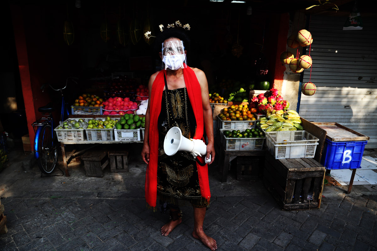 INFONews.id I Surabaya - Seniman kawakan Surabaya, Meimura, mementaskan Ludruk dengan blusukan di Pasar Tradisional Manyar, Surabaya, Rabu (05/8). Pementasan Ludruk yang mengusung tema Besut Rusmini tersebut untuk melawan "Lupa" terhadap bahaya penularan virus Corona.