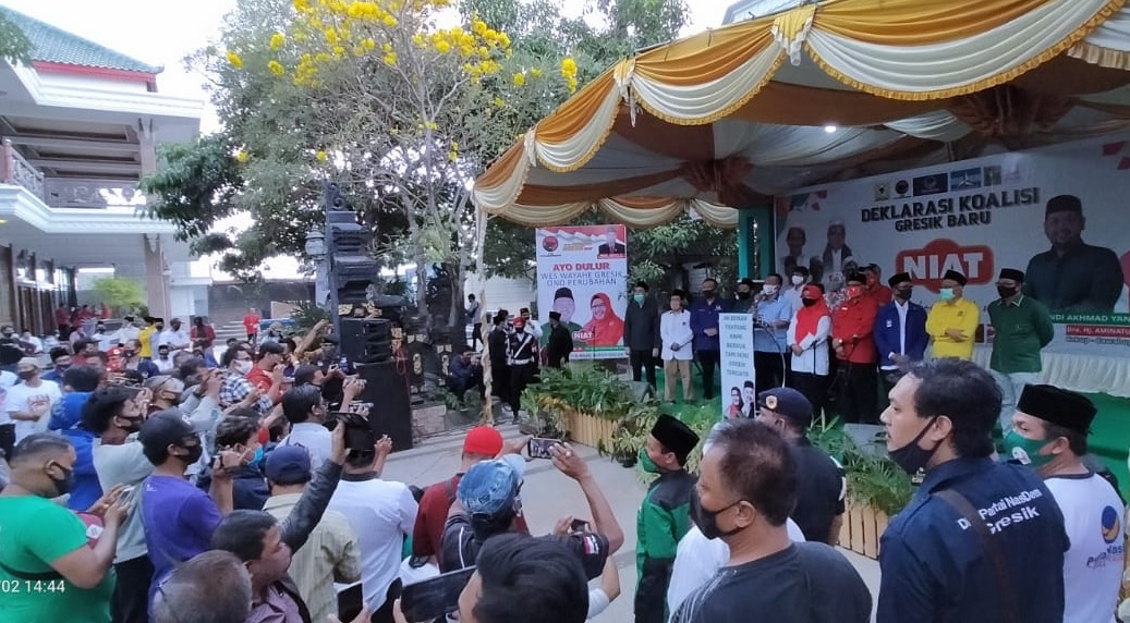 Acara deklarasi yang didukung enam partai koalisi, yaitu Ketua Partai Golkar, PDIP, Demokrat, Nasdem, PPP, dan PAN. Juga beberapa kiai NU Gresik seperti KH. Robbach Maksum, KH. Mahfud Maksum, KH. Masbuchin dan ulama lainnya. Bersatu gotong-royong dengan perubahan, paslon Niat menang.