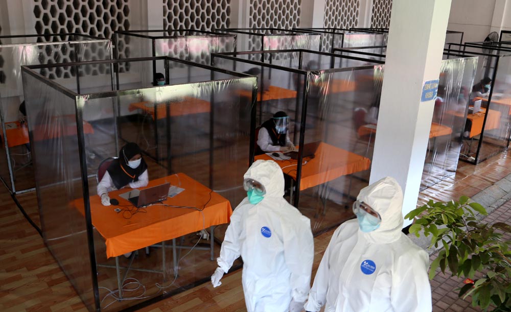 “Lokasinya ada di sisi luar. Di situ juga dilakukan pengawasan secara ketat. Para pengawas juga mengenakan seperangkat Alat Pelindung Diri (APD) lengkap dengan baju hazmat. Peserta tetap fokus mengerjakan karena kami tempatkan di bilik terpisah,” papar dia.