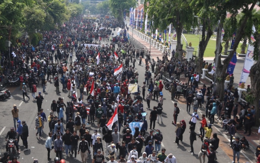 INFONews.id | Surabaya - Kepadatan terjadi menjelang Bundaran Waru dari arah Sidoarjo, massa buruh, mahasiswa juga terlihat pelajar seiring menuju Surabaya, untuk melakukan demo dengan tuntutan tunggal agar pemerintah menolak pengesahan Omnibus Law UU Cipta Kerja.