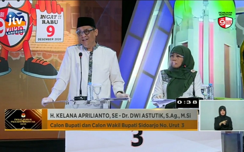 INFOnews.id | Sidoarjo - Pasangan Calon (Paslon) Bupati dan Wakil Bupati Sidoarjo nomor urut 3, Kelana Aprilianto (Mas Kelana) dan Dwi Astutik (Bunda Astutik) terlihat lebih santai dan menyapa semua pihak ketika menyampaikan visi dan misi dalam debat yang dipandu dua host Helmi Kahaf dan Emi Faizza yang digelar secara live stasiun JTV.