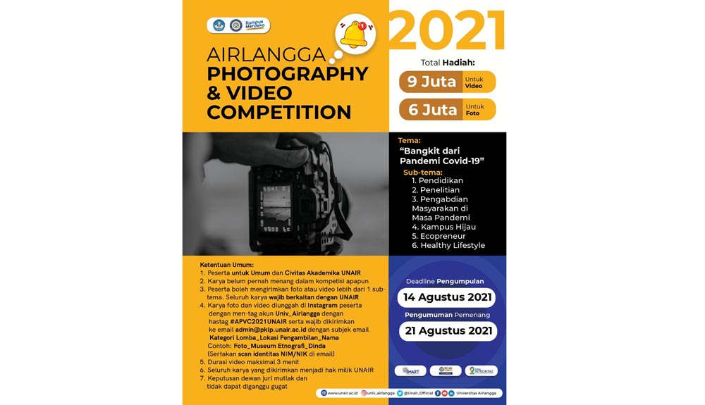 Lomba ini akan digelar hingga 14 Agustus 2021 mendatang dan pemenang akan diumumkan pada 21 Agustus 2021. Pemenang untuk masing-masing kategori lomba akan mendapatkan uang tunai jutaan rupiah dan sertifikat pemenang. Yuk ikut sertakan karyamu di lomba APVC 2021 UNAIR !