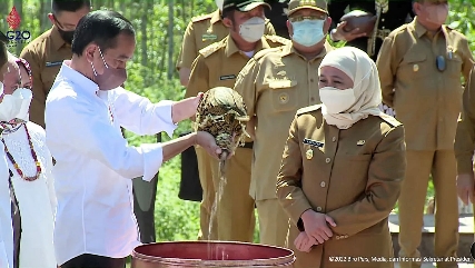 INFOnews.id | Penajam Paser Utara - Gubernur Jawa Timur Khofifah Indar Parawansa mengikuti rangkaian kegiatan prosesi penyatuan tanah dan air dari 34 Provinsi se-Indonesia bersama Presiden RI Joko Widodo (Jokowi) di kawasan Titik Nol Ibu Kota Negara (IKN) Nusantara, Kec. Sepaku, Kab. Penajam Paser Utara Kalimantan Timur, Senin (14/3/2022).