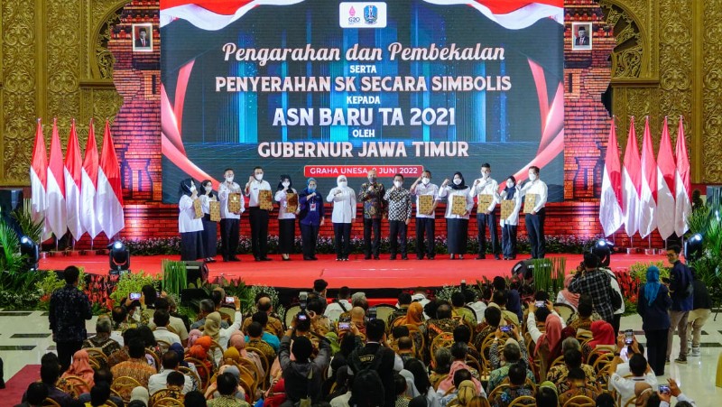 INFOnews.id - Surabaya - Gubernur Jawa Timur Khofifah Indar Parawansa menyerahkan secara simbolis Surat Keputusan (SK) kepada para Calon Pegawai Negara Sipil (CPNS) dan Pegawai Pemerintah dengan Perjanjian Kerja (PPPK) hasil seleksi tahun 2021, Rabu (8/6/2022).