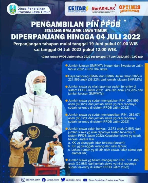 Gubernur Khofifah menuturkan, jadwal terakhir tahapan pengambilan PIN seharusnya ditutup kemarin hari (Sabtu, 18 Juni) pukul 23.59 WIB. Namun, masih banyak lulusan SMP yang belum melakukan pengambilan PIN. Sehingga perpanjangan pengambilan PIN akan dilakukan hingga 4 Juli 2022 pukul 23.59 WIB.