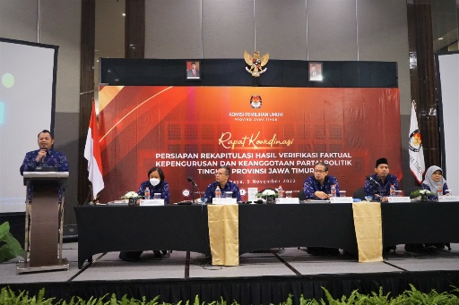 INFOnews.id | Surabaya - Komisi Pemilihan Umum Provinsi Jawa Timur (KPU Jatim) menggelar Rapat Koordinasi (Rakor) Persiapan Rekapitulasi Hasil Verifikasi Faktual Kepengurusan dan Keanggotaan Partai Politik Tingkat Provinsi Jawa Timur, Sabtu (5/11/2022).