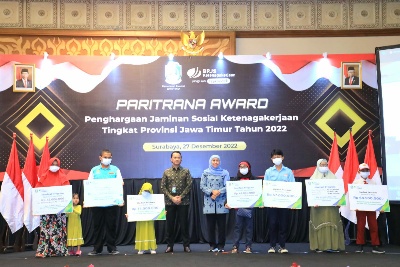 INFOnews.id | Surabaya - Gubernur Jawa Timur Khofifah Indar Parawansa memberikan Penganugerahan Penghargaan Jaminan Sosial Ketenagakerjaan (Paritrana Award) Provinsi Jawa Timur Tahun 2022 di Shangri-La Hotel Surabaya, Selasa (27/12/2022).