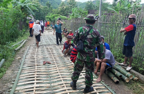 Sebelumnya, jembatan di desa itu putus total akibat deraan banjir dua hari sebelumnya. Jembatan darurat dibangun di area bekas jembatan yang terputus. Konstruksi jembatan menggunakan bahan _hot rolled_ (baja serupa huruf 'H'), dengan kombinasi anyaman bambu.