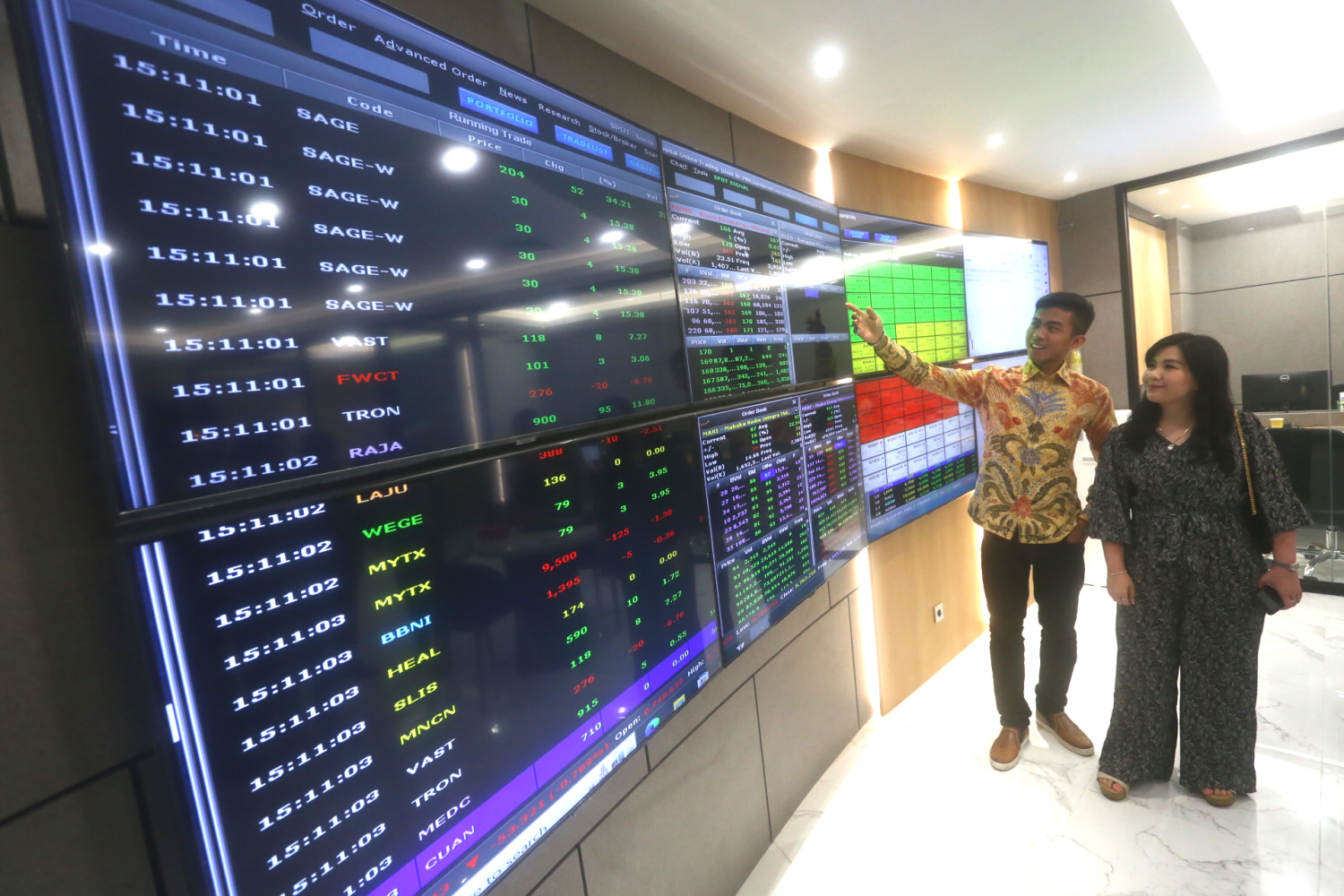 CEO Sucor Sekuritas, Bernardus Wijaya, menunjukkan pergerakan saham saat meresmikan kantor cabang di Voza Premium Office Tower, Surabaya pada Senin (27/03/2023). INPhoto/Ali
