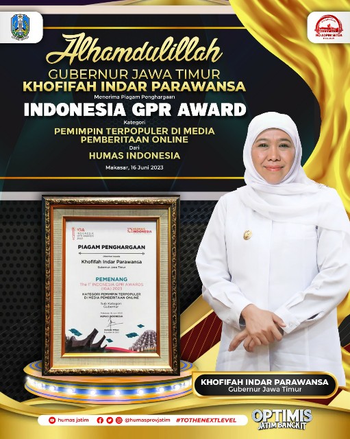 Anugerah sebagai Pemimpin Terpopuler di Media Online tahun 2023 diterima Gubernur Khofifah yang diwakili oleh Dinas Kominfo Jatim, dalam penyelenggaraan The 1st Indonesia GPR Awards (IGA) 2023 di Kota Makassar, Sulawesi Selatan, Jumat (16/6/2023).