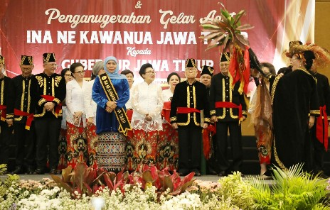 INFOnews.id | Surabaya - Gubernur Jawa Timur Khofifah Indar Parawansa dianugerahi gelar adat Minahasa "Ina Ne Kawanua Jawa Timur" oleh Dewan Pengurus Kerukunan Keluarga Kawanua (K3) Jawa Timur. Gelar Ina Ne Kawanua Jawa Timur berarti "Ibu Masyarakat Minahasa Jawa Timur".