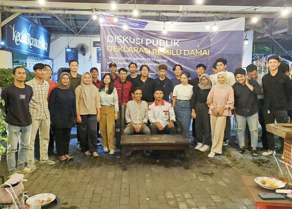 INFOnews.id | Surabaya - Ikatan Lembaga Mahasiswa Ilmu Sosial dan Ilmu Politik (ILMISPI) Jawa Timur menggelar Dialog Publik Deklarasi Pemilu Aman dan Damai di Kedai Roemah Akiq, Surabaya, Kamis (30/11/2023).