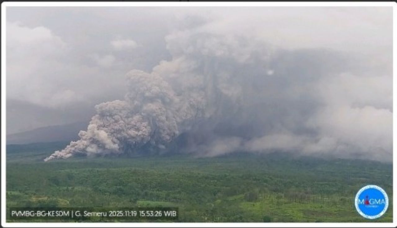 SURABAYA, INFONews.ID - Erupsi Gunung Semeru di Jawa Timur terjadi pada tanggal 19 November 2025, pukul 16:00 WIB dengan tinggi kolom abu teramati ± 2.000 m di atas puncak (± 5.676 mdpl (di atas permukaan laut), Rabu, (19/11/2025).