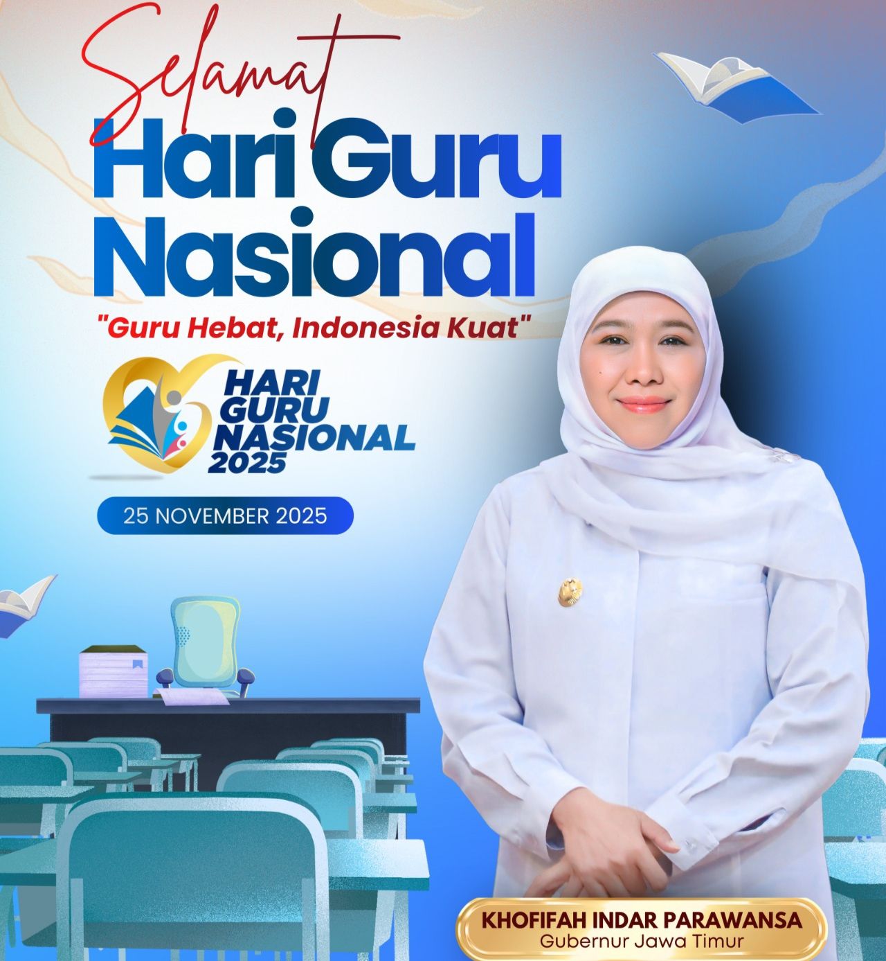 "Ini sejalan dengan tema Hari Guru Nasional Tahun 2025 yaitu 'Guru Hebat, Indonesia Kuat'. Setiap capaian pendidikan di Jawa Timur selalu berpulang pada sosok guru yang hebat, membuat para siswa dan Jatim kuat. Mulai dari keteladanan mereka, keikhlasan mereka mendidik, dan kerja sunyi mereka yang tanpa henti membimbing anak-anak kita,” ujar Khofifah di Surabaya, Selasa (25/11/2025).