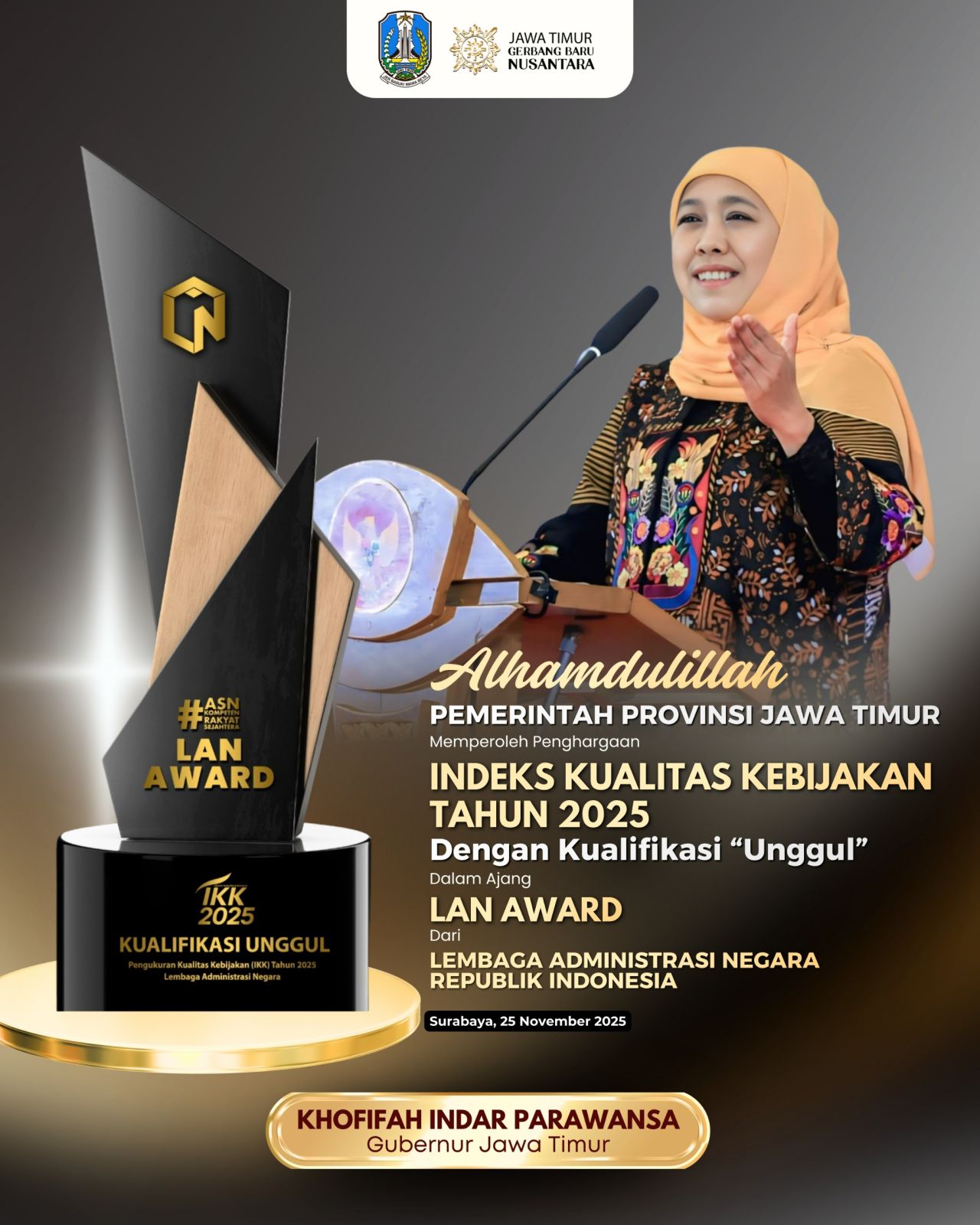 Gubernur Khofifah juga mengapresiasi LAN RI yang menaruh kepercayaan bagi Jawa Timur sebagai tuan rumah pada penyelenggaraan Penghargaan IKK Nasional tahun 2025 kali ini.