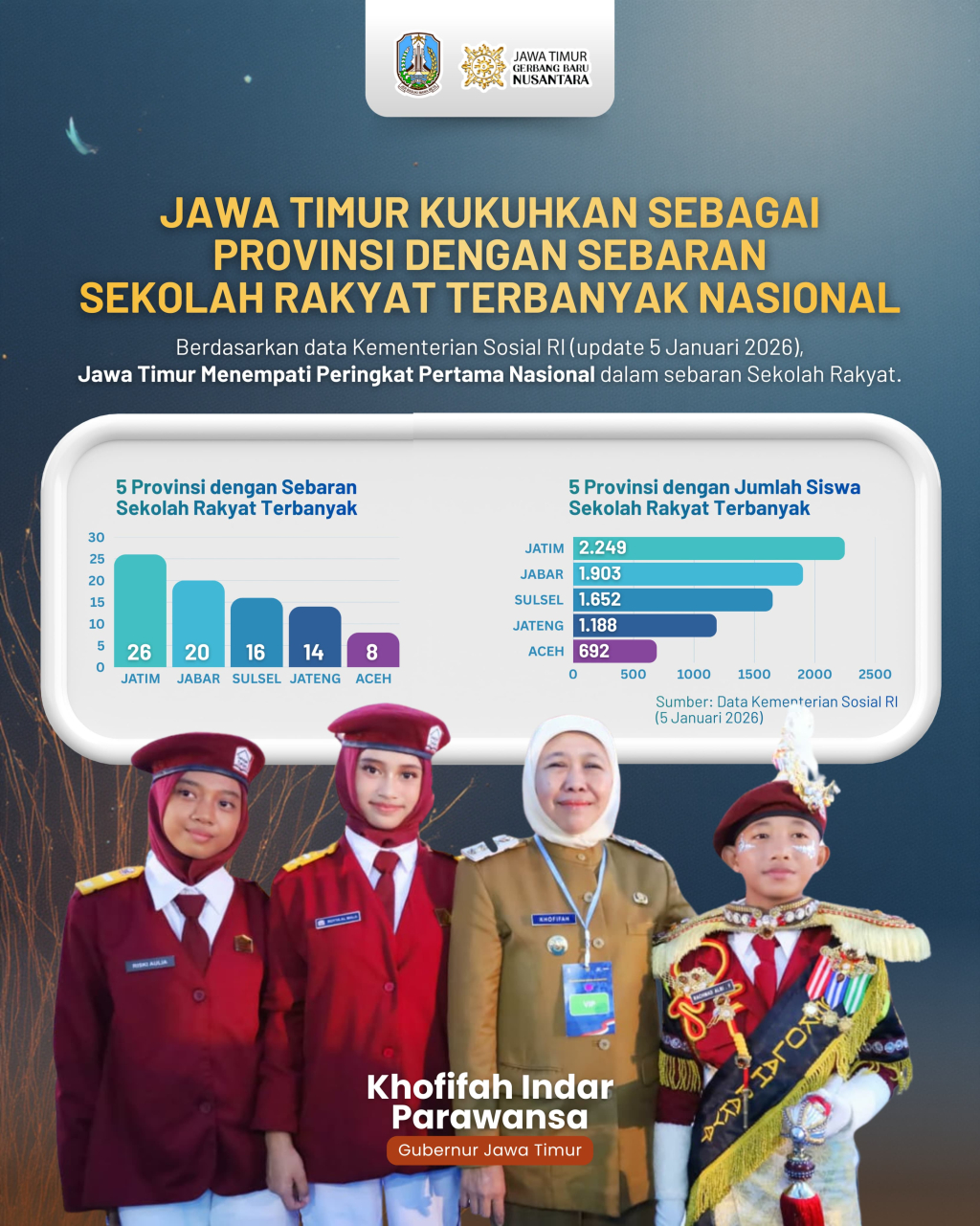 “Dari 26 SR di Jawa Timur tersebut terdapat 2.450 siswa yang sudah menuntut ilmu di Sekolah Rakyat. Terima kasih kepada Menteri Sosial RI dan semua pihak maupun elemen yang sudah ikut berkontribusi dalam program SR di Jatim,” jelasnya, dan disebut Jatim sangat gencar memasifkan program Sekolah Rakyat. Karena inilah cara efektif memutus mata rantai kemiskinan.