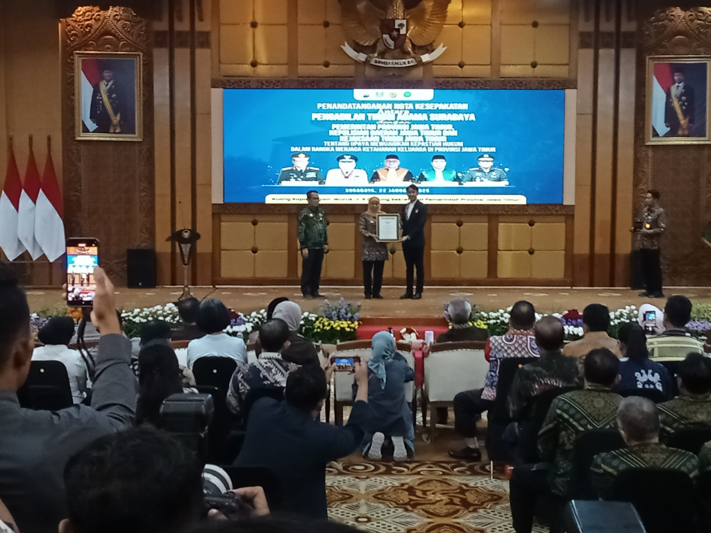 SURABAYA, iNFONews.ID – Gubernur Jawa Timur Khofifah Indar Parawansa menandatangani Nota Kesepakatan (MoU) dengan Pengadilan Tinggi Agama Surabaya sebagai upaya mewujudkan kepastian hukum untuk menjaga ketahanan keluarga masyarakat di Provinsi Jatim. Penandatanganan MoU dilaksanakan di Ruang Hayam Wuruk Kantor Sekretariat Daerah Provinsi Jatim, Surabaya, Kamis (22/1/2026).