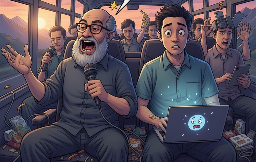 Perjalanan ke Bromo kali ini terasa lebih berbobot bagi saya karena posisi kursi yang strategis. Di sebelah saya duduk Tuji Martudji, seorang wartawan senior yang dikenal kritis dan selalu menjadi orator andalan setiap kali ada aksi massa wartawan.