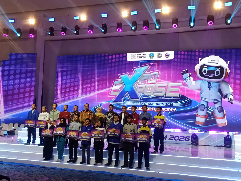 Gubernur Khofifah Beri Bantuan Pelajar Berprestasi Di Penutupan Expo & Expose SMK Jatim 2026 (IN/PHOTO: TUDJI)