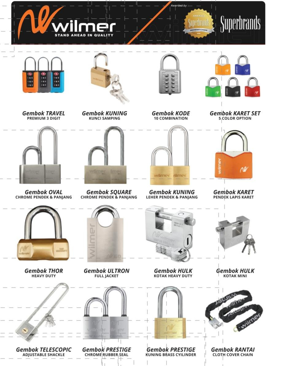 Selain produk-produk di atas, Wilmer juga menghadirkan berbagai jenis gembok lain yang dapat disesuaikan dengan kebutuhan spesifik pengguna. Antara lain gembok rantai (chain lock) yang cocok digunakan untuk pengamanan motor dan sepeda, gembok lapis karet untuk melindungi permukaan dari goresan sekaligus lebih tahan terhadap cuaca, gembok kode (combination lock) untuk penggunaan praktis tanpa anak kunci, serta berbagai varian gembok lainnya dengan desain dan fitur yang beragam.