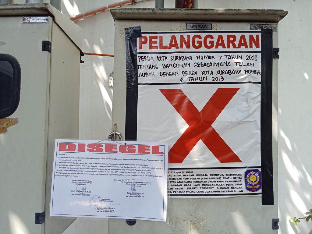 Pembongkaran mengacu Pasal 5 ayat 1 Perda Kota Surabaya No 7 Tahun 2009, Tentang Bangunan, yang diubah dengan Perda Kota Surabaya No 6 Tahun 2013. Serta Perwali Kota Surabaya No 114 Tahun 2021, tentang Pedoman Pengendalian Menara Telekomunikasi di wilayah Kota Surabaya.